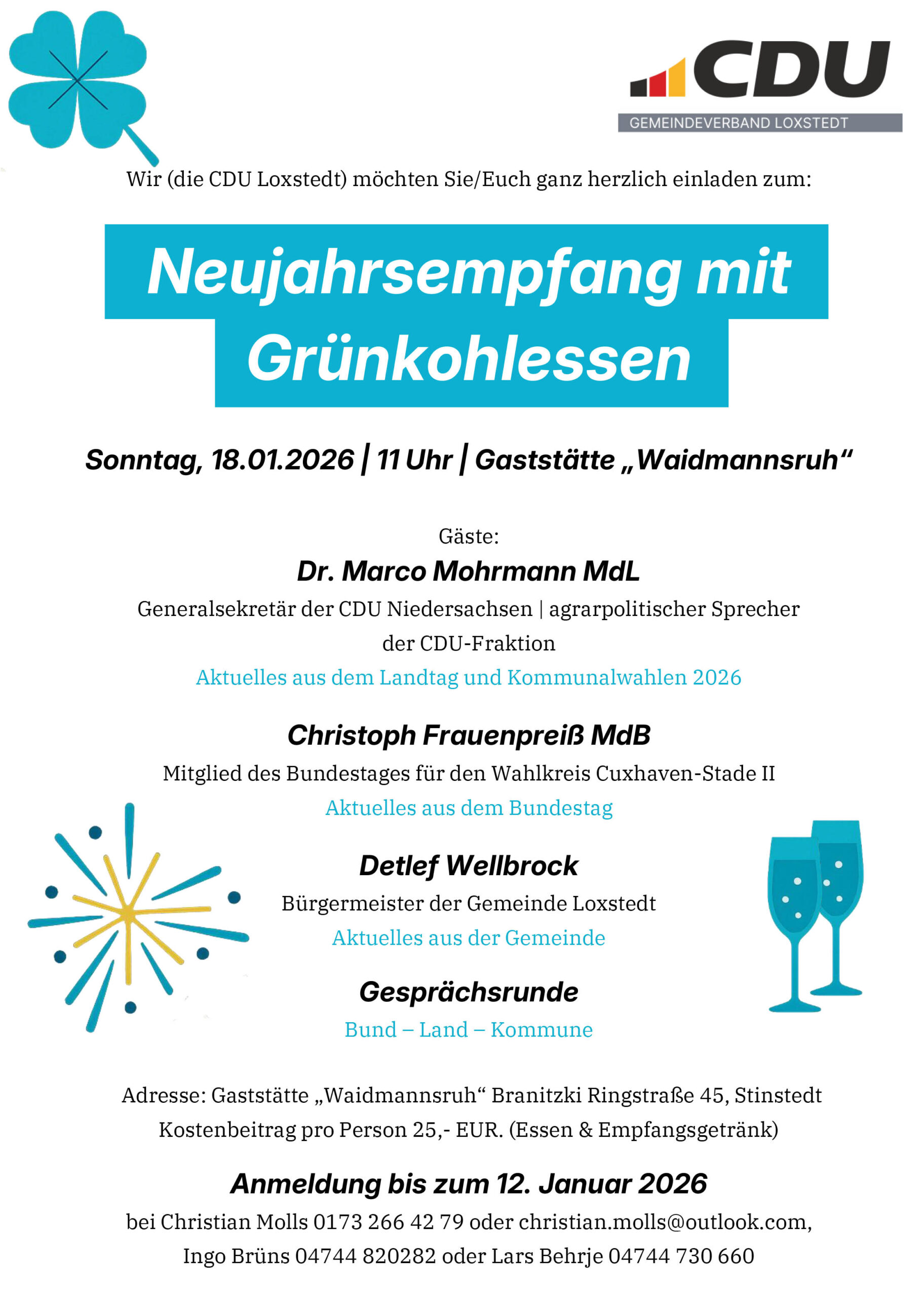 Die CDU Loxstedt lädt am Sonntag, den 18. Januar 2026, um 11 Uhr zum Neujahrsempfang mit Grünkohlessen in die Gaststätte „Waidmannsruh“ in Loxstedt-Stinstedt ein.