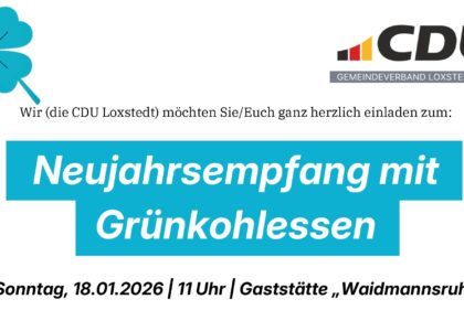 Die CDU Loxstedt lädt am Sonntag, den 18. Januar 2026, um 11 Uhr zum Neujahrsempfang mit Grünkohlessen in die Gaststätte „Waidmannsruh“ in Loxstedt-Stinstedt ein.