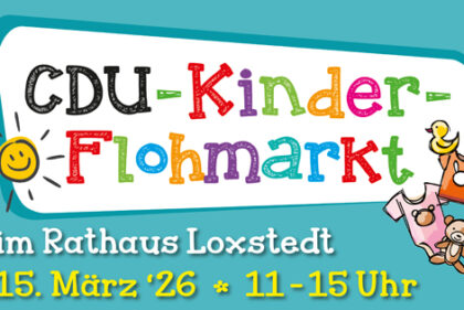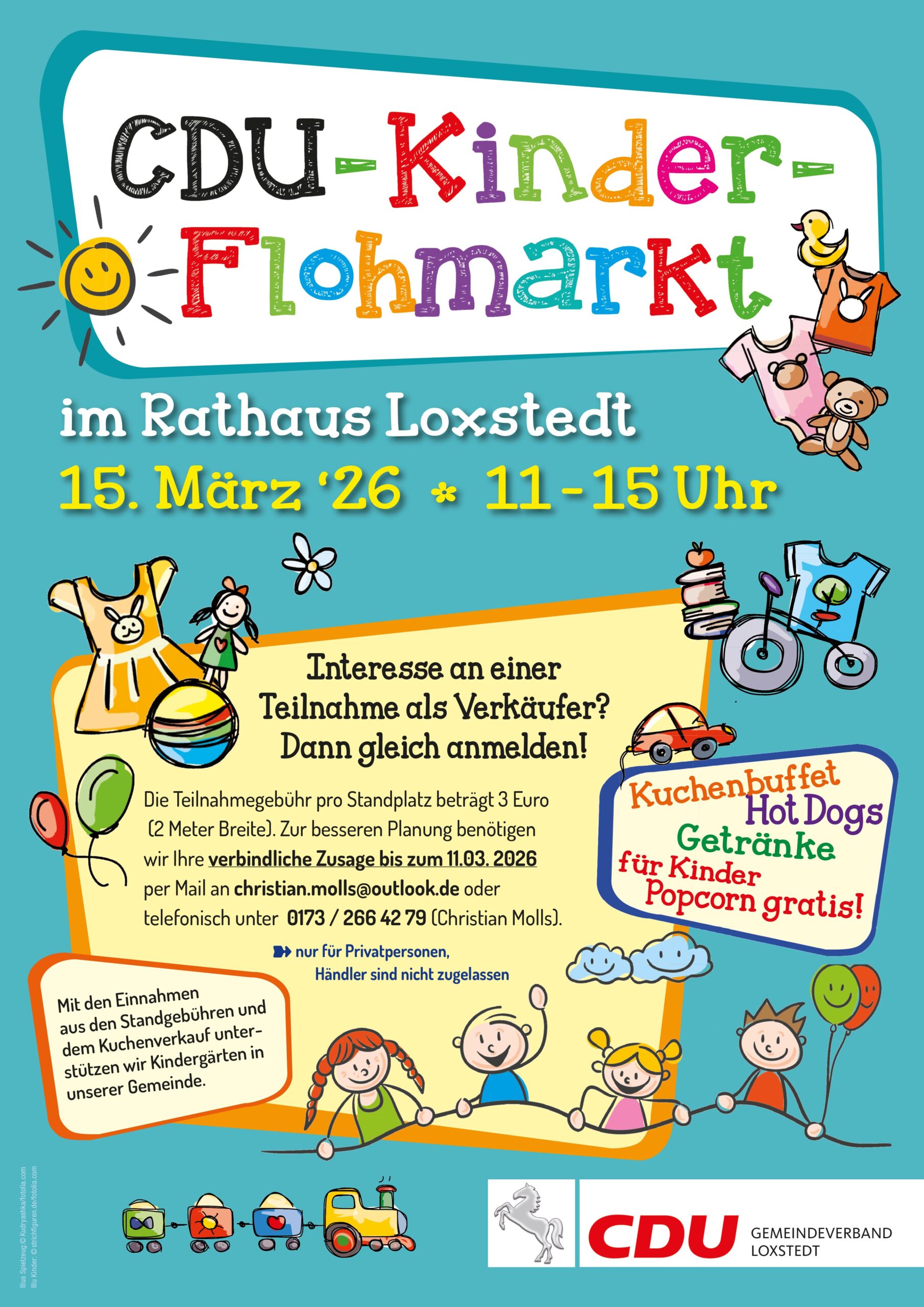 Kommt vorbei zum bunten Kinderflohmarkt der CDU Loxstedt: Stöbert nach gut erhaltenem Spielzeug, Kinderkleidung, Büchern und mehr. Ein familienfreundlicher Nachmittag mit Kuchenbuffet, Hot Dogs, Getränken und kostenlosem Popcorn für die Kinder erwartet euch. Für kleine Entdecker und Schnäppchenjäger — ideal, um Platz zu schaffen und gleichzeitig Gutes zu tun.